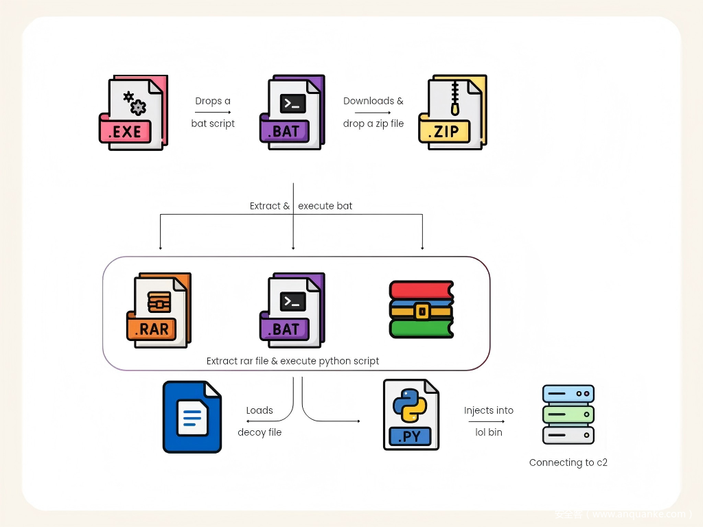 攻击链始于一个 PE 投放器,它在运行时解密嵌入的 payload,重建恶意批处理脚本(config.bat )并写入磁盘。恶意软件遵循多步骤解压流程,最终执行 Python 代码。