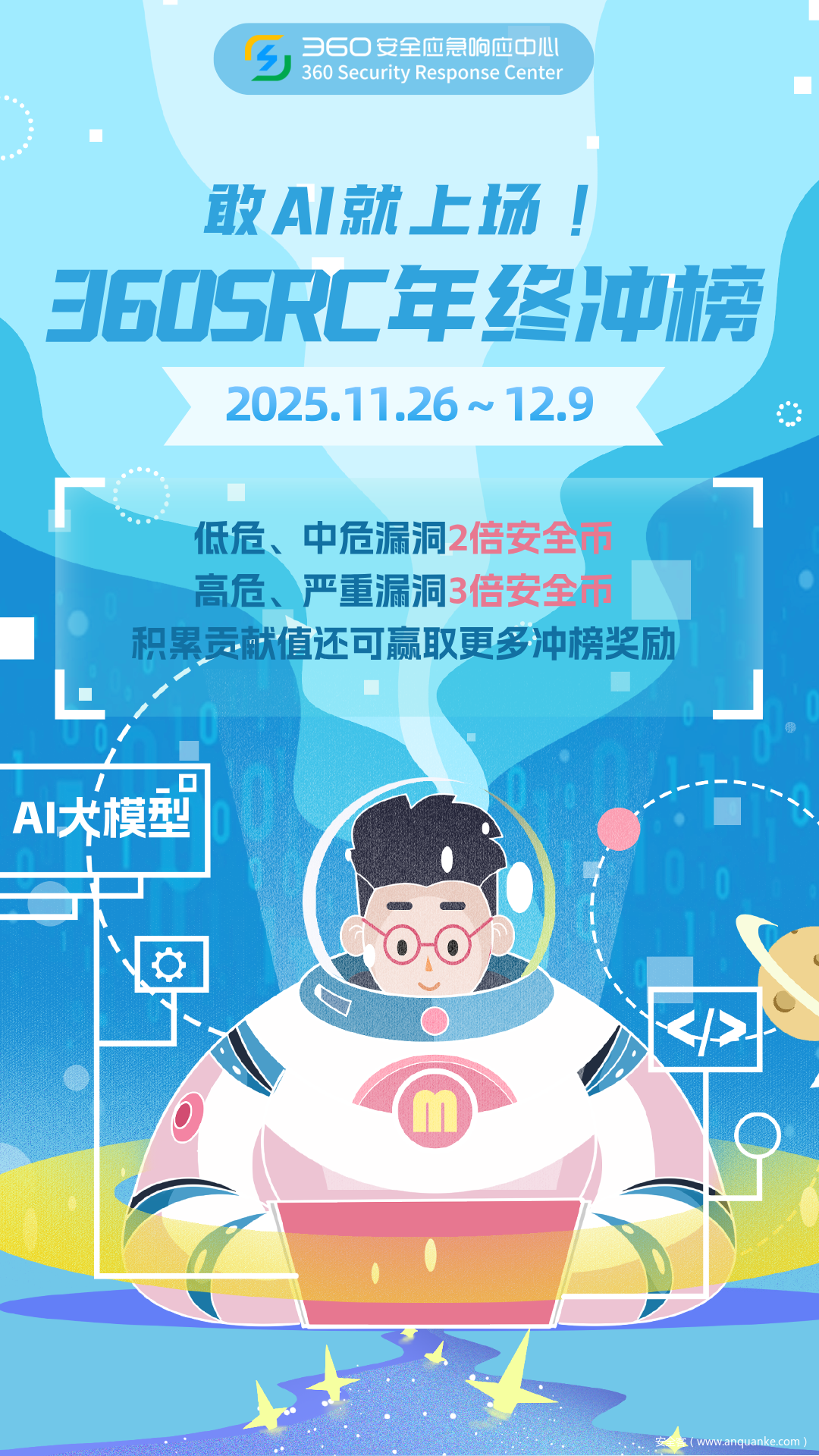 活动期间组队提交【纳米 AI 搜索、360 智脑】漏洞,可积累 AI 大模型安全漏洞挑战赛积分,受邀前往上海参与线下赛。
