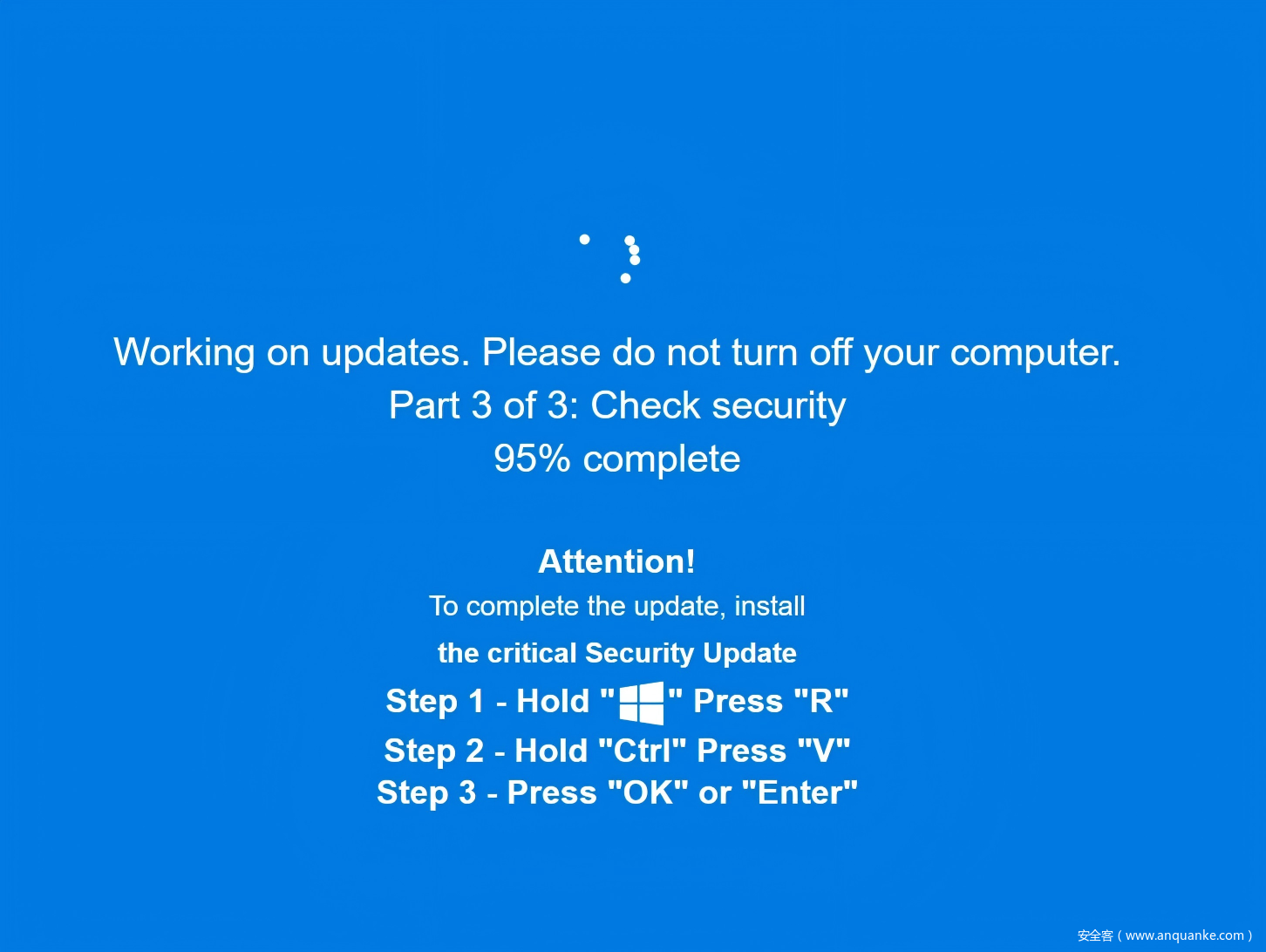 近期的活动变体采用了另一种诱饵:当潜在目标访问页面时,浏览器进入全屏模式并显示 高度逼真的 Windows 更新界面,要求用户执行上述操作“以完成更新”。