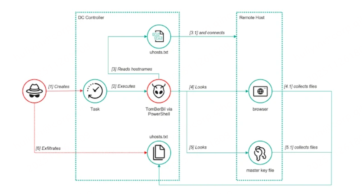 恶意软件通过计划任务执行 PowerShell 命令启动,具体而言,它通过 SMB 搜索远程主机中的浏览器历史记录、cookies 和保存的凭据。尽管包含信息的复制文件使用 Windows 数据保护 API(DPAPI)加密,但 TomBerBil 能够捕获解密所需的加密密钥。