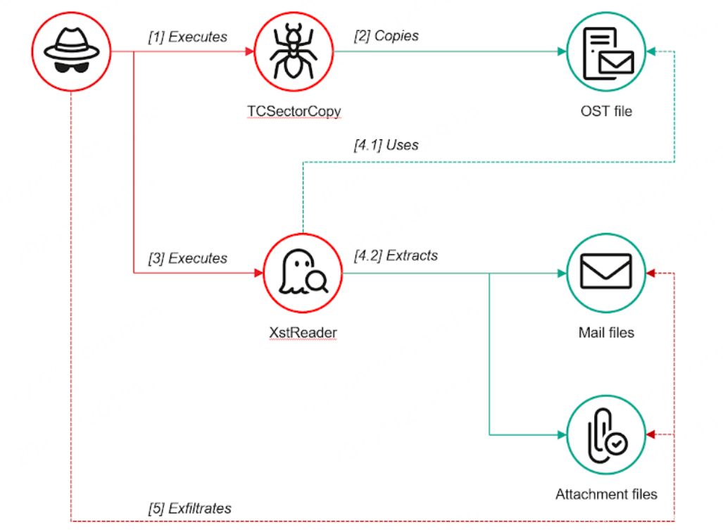 ToddyCat 还使用 TCSectorCopy(“xCopy.exe ”)访问本地 Microsoft Outlook 存储的 OST 文件(脱机存储表),绕过应用运行时对文件的访问限制。