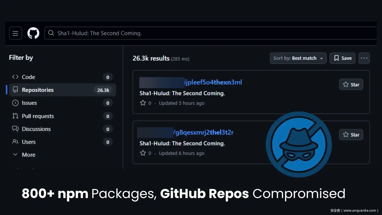 - 机密窃取:使用 TruffleHog 扫描暴露的密钥,包括 API 密钥、身份验证令牌、GitHub 凭据和云访问令牌。所有发现的敏感信息均被泄露至名为“Sha1-Hulud: The Second Coming”的公开 GitHub 仓库,研究人员已识别出 26,300 个攻击者创建的受损仓库。
