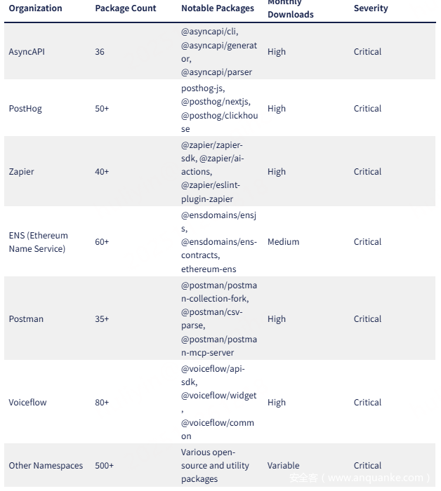 受影响的包来自多家大型科技组织,包括 AsyncAPI(36 个包)、PostHog(多个分析包)、Zapier(多个 SDK 和插件组件)、Postman(集合和工具包)、ENS(以太坊域名服务包)以及无数小型组织。AsyncAPI 团队证实,攻击者甚至在其 CLI 仓库中创建了恶意分支,表明 GitHub 凭据可能已被直接攻陷。