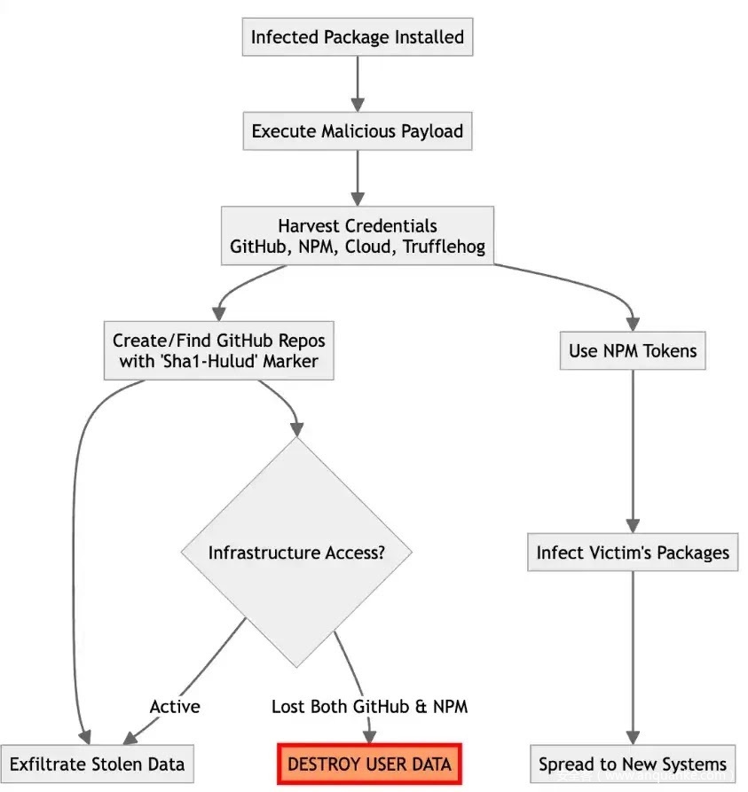 该恶意软件是“沙虫蠕虫(Shai-Hulud)”的进化版本,包含一个危险功能:若攻击者失去基础设施控制权,将 销毁用户数据。恶意软件通过多阶段流程在受感染的 npm 包中传播。