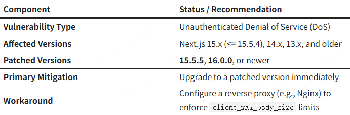 Vercel 已于 2025 年 10 月 13 日修复该漏洞,引入 10MB 的默认内部缓冲区大小限制。管理员被敦促立即升级,或实施严格的代理级约束。