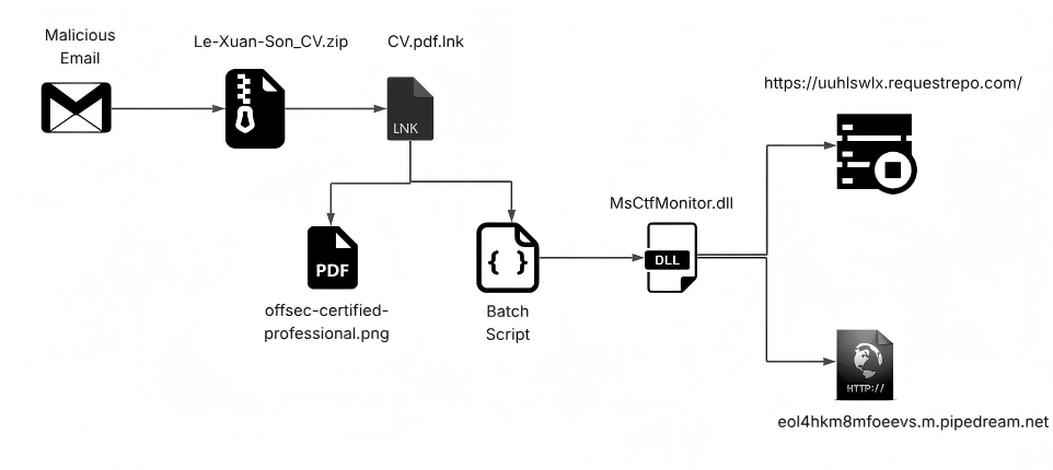 攻击以典型的鱼叉式钓鱼战术启动:恶意邮件包含名为 Le-Xuan-Son_CV.zip 的 ZIP 压缩包。受害者在其中会发现一份看似属于软件开发人员“Le Xuan Son”的简历,附带河内地址和 GitHub 个人资料。