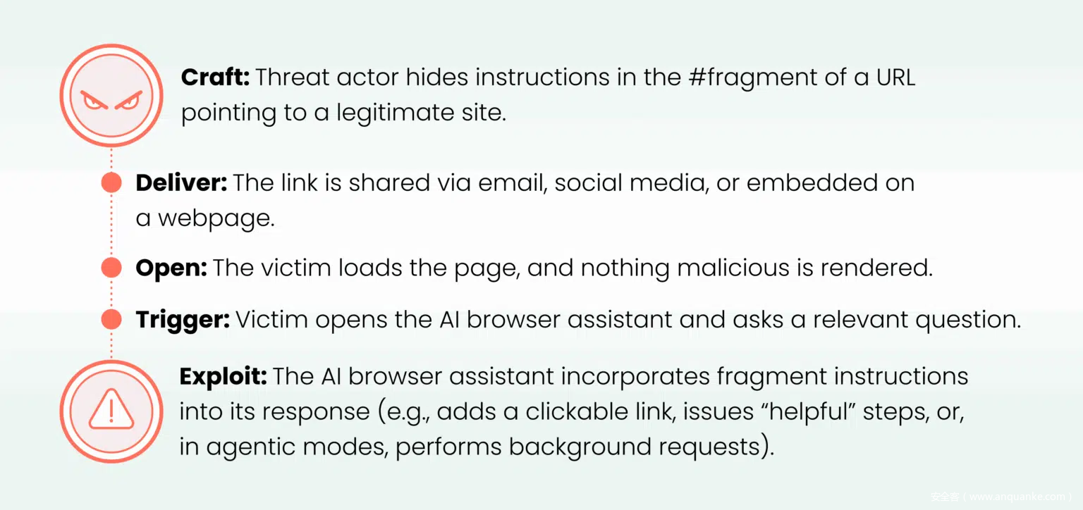 HashJack是首个此类间接提示注入技术案例。攻击者将命令隐藏在AI稍后会读取的内容中,在这种情况下,就是URL本身。这使得HashJack能够利用AI助手读取完整URL的方式,包括#之后的部分(URL片段),而这部分通常是Web服务器会忽略的。