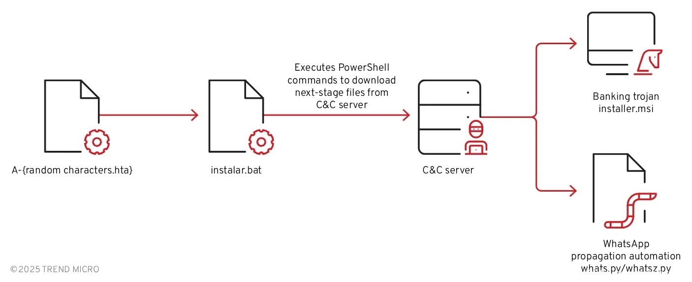 此过程会静默下载银行木马,同时部署自动化脚本来劫持受害者的WhatsApp会话以进一步传播,确保攻击范围最大化。