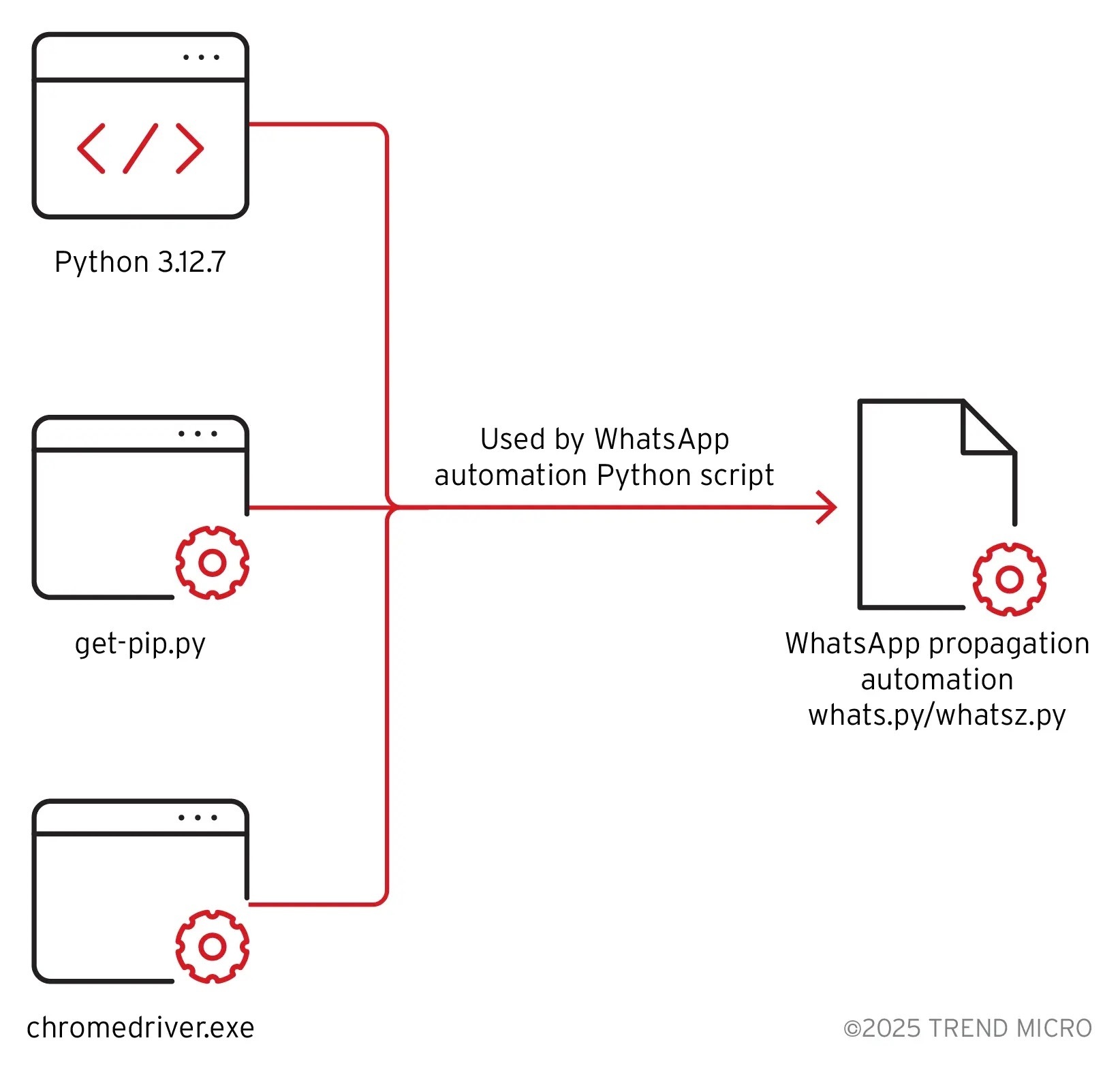 该脚本依赖chromedriver.exe 等组件文件自动化感染过程,使用Selenium注入WA-JS库、提取联系人列表,并向不知情的受害者批量发送恶意文件。
