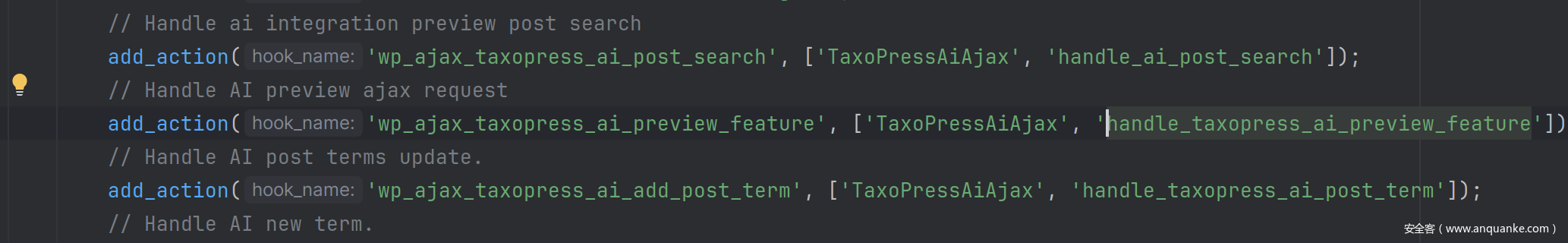 这是WordPress的AJAX路由机制。当收到action=taxopress_ai_preview_feature的POST请求时,WordPress会自动调用TaxoPressAiAjax::handle_taxopress_ai_preview_feature()方法。