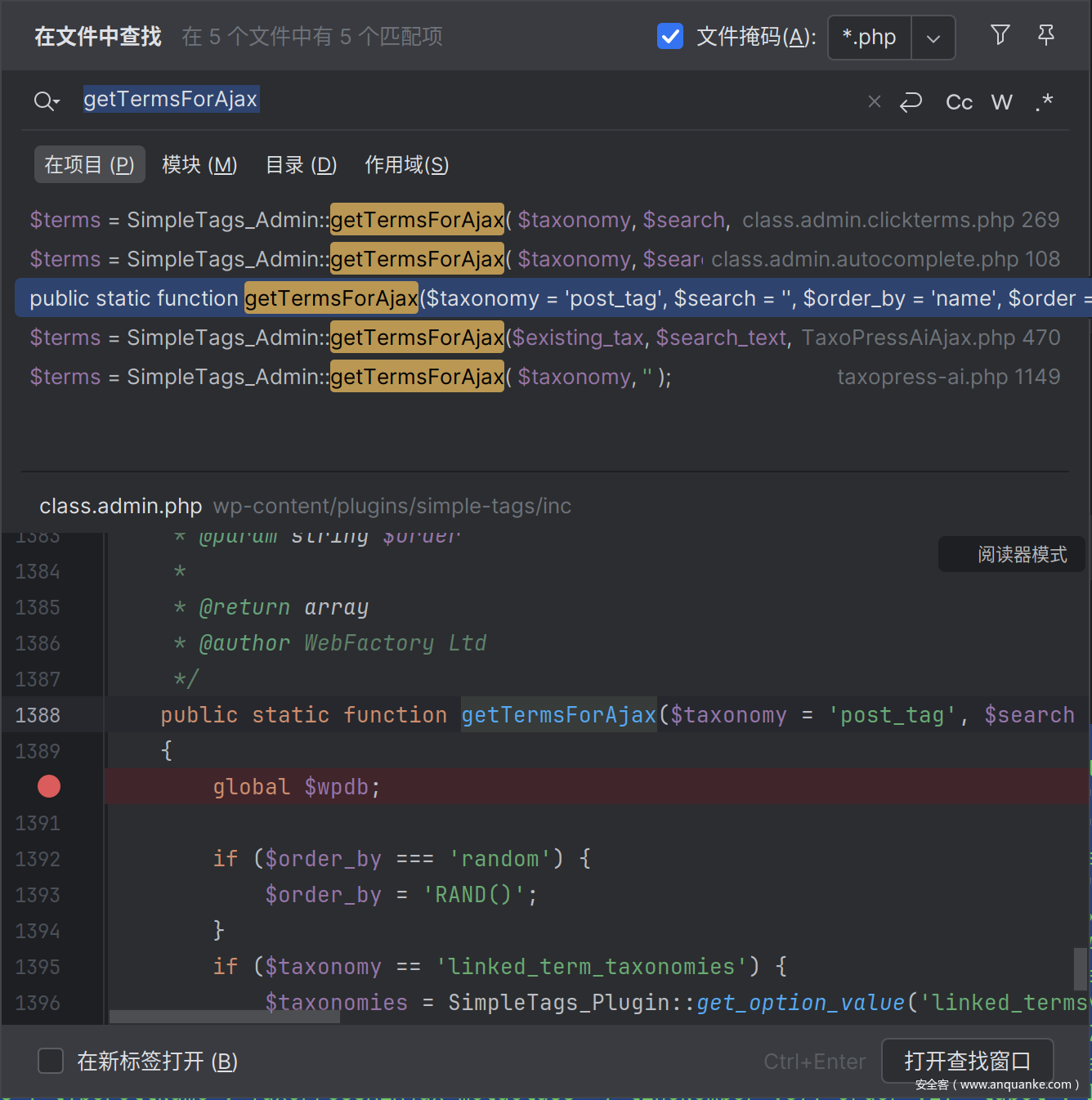 根据CVE描述,漏洞位于getTermsForAjax函数中。我首先在代码库中搜索这个函数: