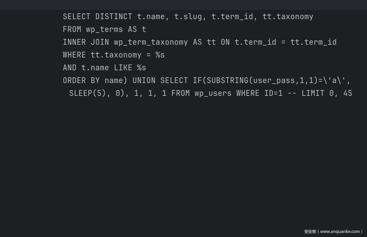 SUBSTRING(user_pass,1,1)='a'中的字符位置和值,可以逐字符提取密码哈希 - 数据提取:即使没有直接输出,攻击者也可以通过响应时间判断数据内容