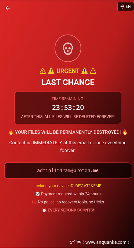 与传统加密型勒索软件不同,这款恶意软件根本无需对数据进行加密 —— 它只需发送恢复出厂设置指令,就能直接抹除设备中的全部数据。