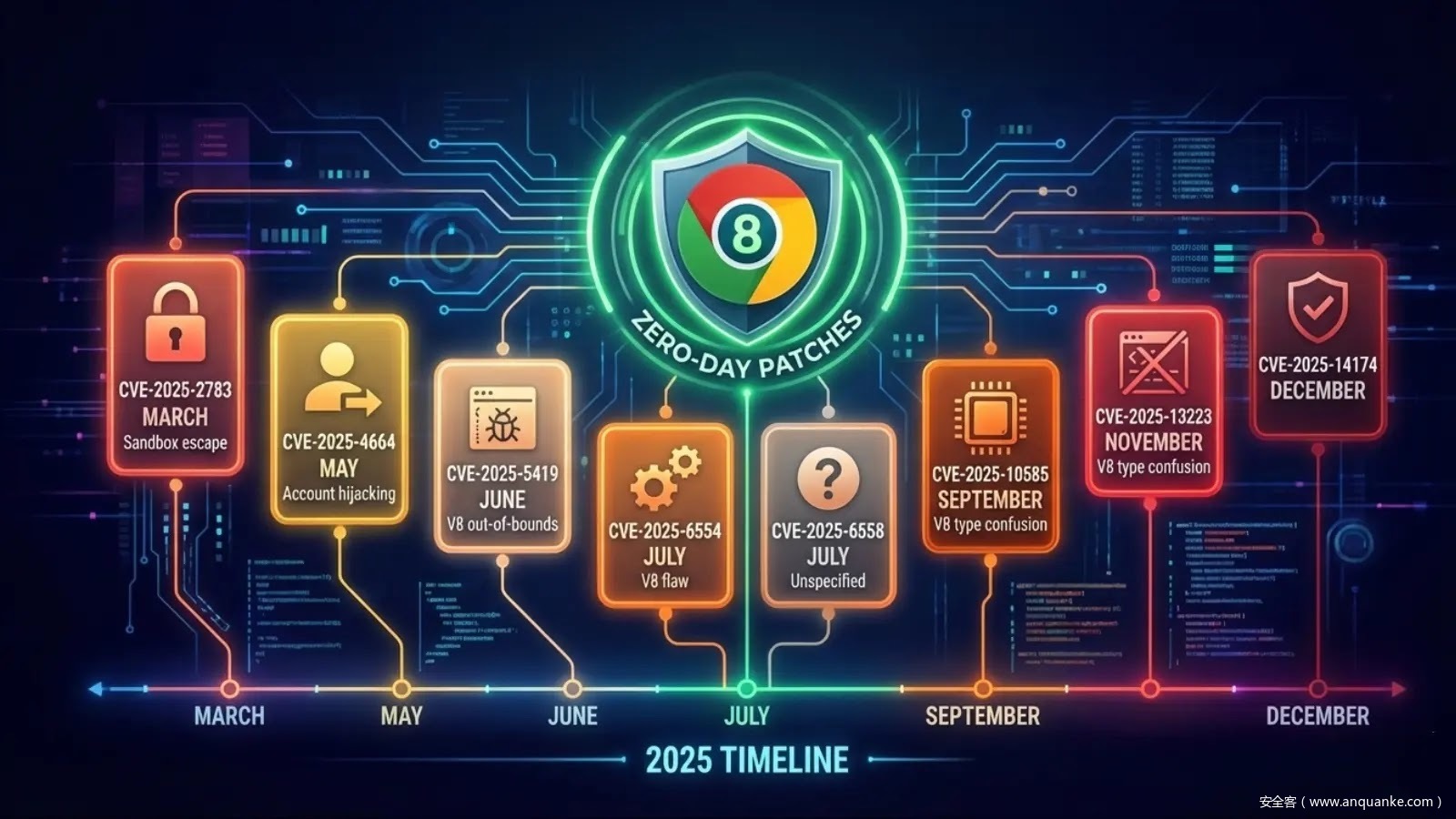 - 11 月:第七个零日漏洞 CVE-2025-13223 出现,同样针对 V8 引擎,利用类型混淆技术,与间谍行动相关