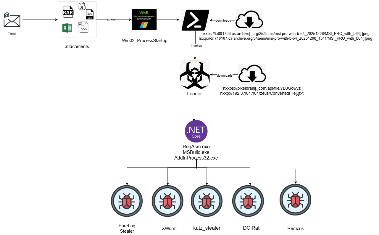 尽管攻击采用多种入口点 —— 从武器化 Office 文档到恶意 SVG 文件 —— 但最终都会汇聚到一个统一的危险节点:“通用商品化加载器”。