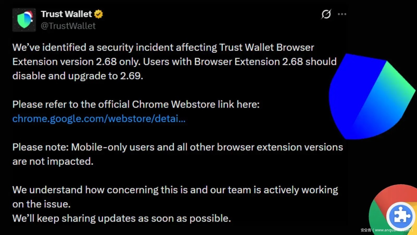 Trust Wallet 于 12 月 25 日通过社交平台 X 承认了此次安全漏洞事件,并证实受影响的仅有 2.68.0 版本。