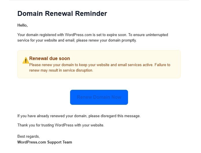 admin@theyounginevitables.com 邮箱发出,该域名伪造了 WordPress 官方支持的名义。对邮件头的分析结果显示,该域名的 DMARC 策略配置极为宽松(p=NONE),使得攻击者可以不受限制地伪造发件人身份。安全人员建议 WordPress 用户:对任何未注明具体域名的续费通知保持高度警惕,务必通过 WordPress.com 官方后台直接核实账户状态。