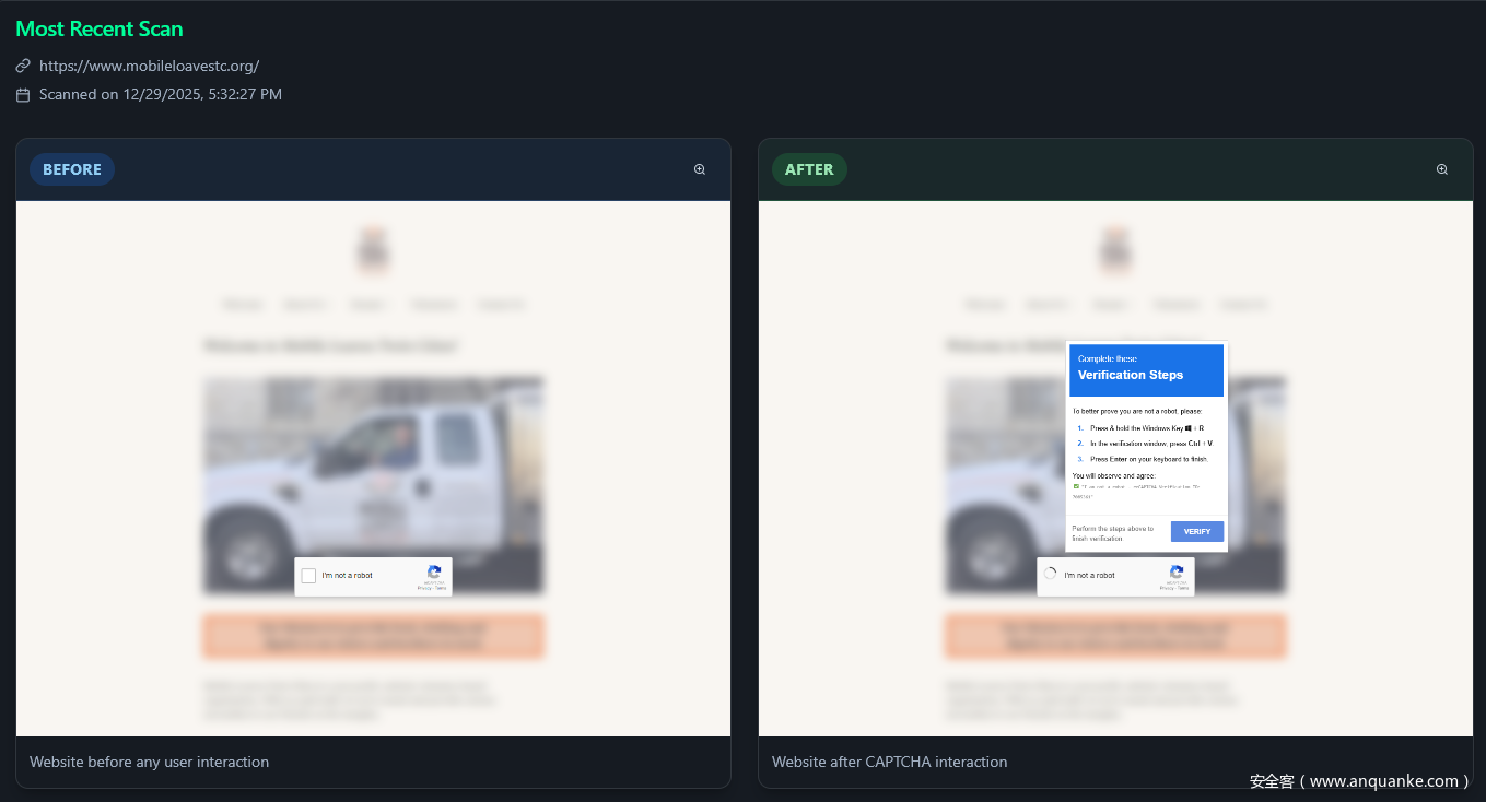 攻击的起始环节为:受害者访问已遭入侵的网站时,页面会弹出模仿谷歌人机验证(reCAPTCHA)或浏览器错误提示的虚假安全弹窗。
