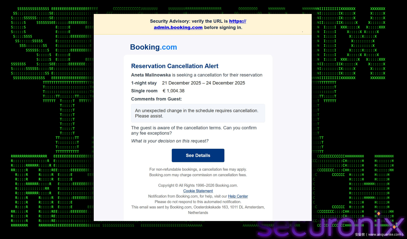 攻击的初始环节极具迷惑性:攻击者会向酒店工作人员发送钓鱼邮件,内容伪装成缤客(Booking.com)平台的预订取消通知或咨询请求。一旦受害者点击邮件中的链接,跳转到的并非旅游网站,而是一个恶意陷阱页面。