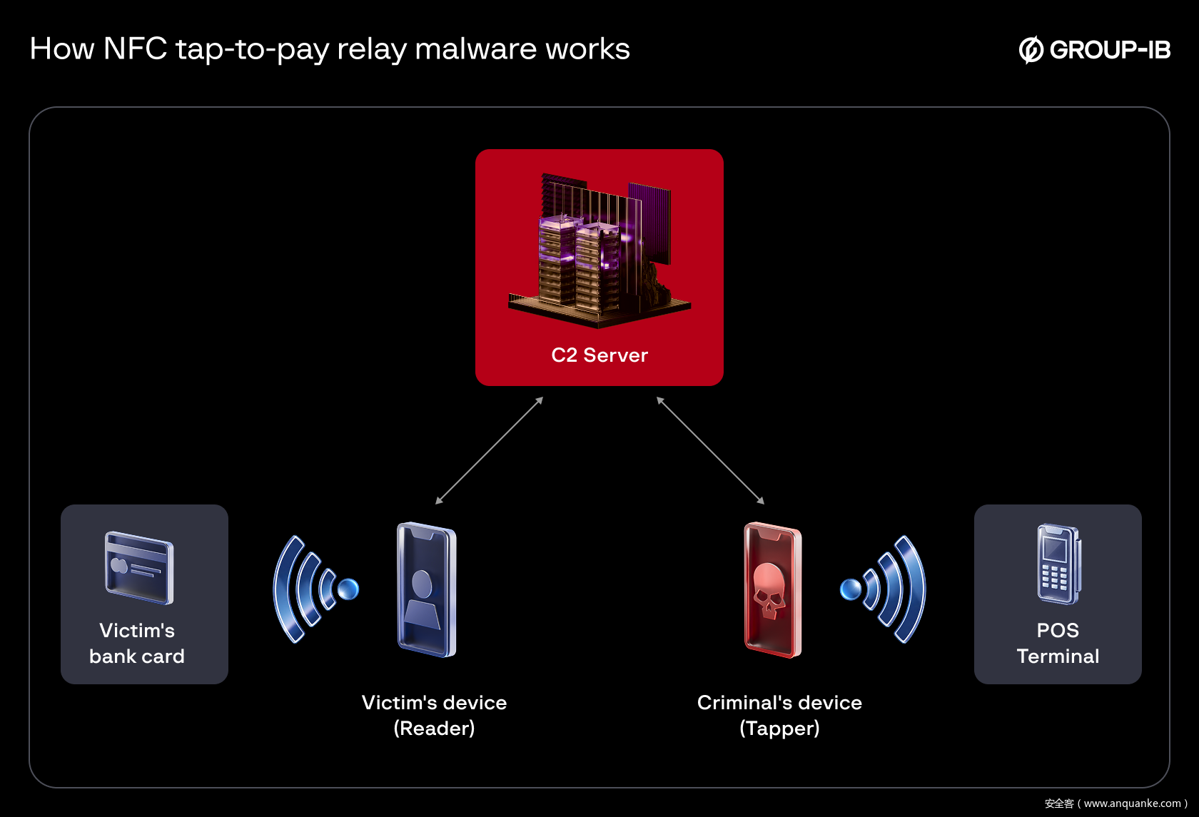 Group-IB 的研究人员解释道:“这种技术能让不法分子远程完成支付或套现操作,就好像受害者的银行卡物理在场一样。”