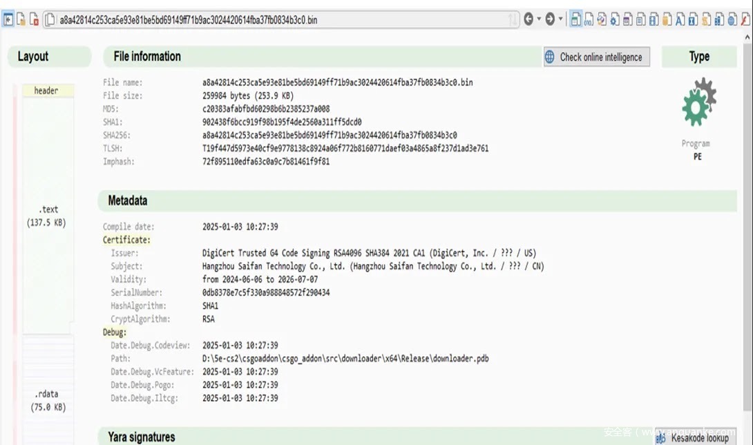 ValleyRAT_S2 激活后,会对系统进程、文件系统及注册表项展开扫描,随后通过自定义 TCP 协议,连接预先写入代码的命令与控制(C&C)服务器,例如27.124.3.175:14852。该病毒具备文件上传下载、执行 Shell 命令、注入恶意载荷、记录键盘输入等多种功能,