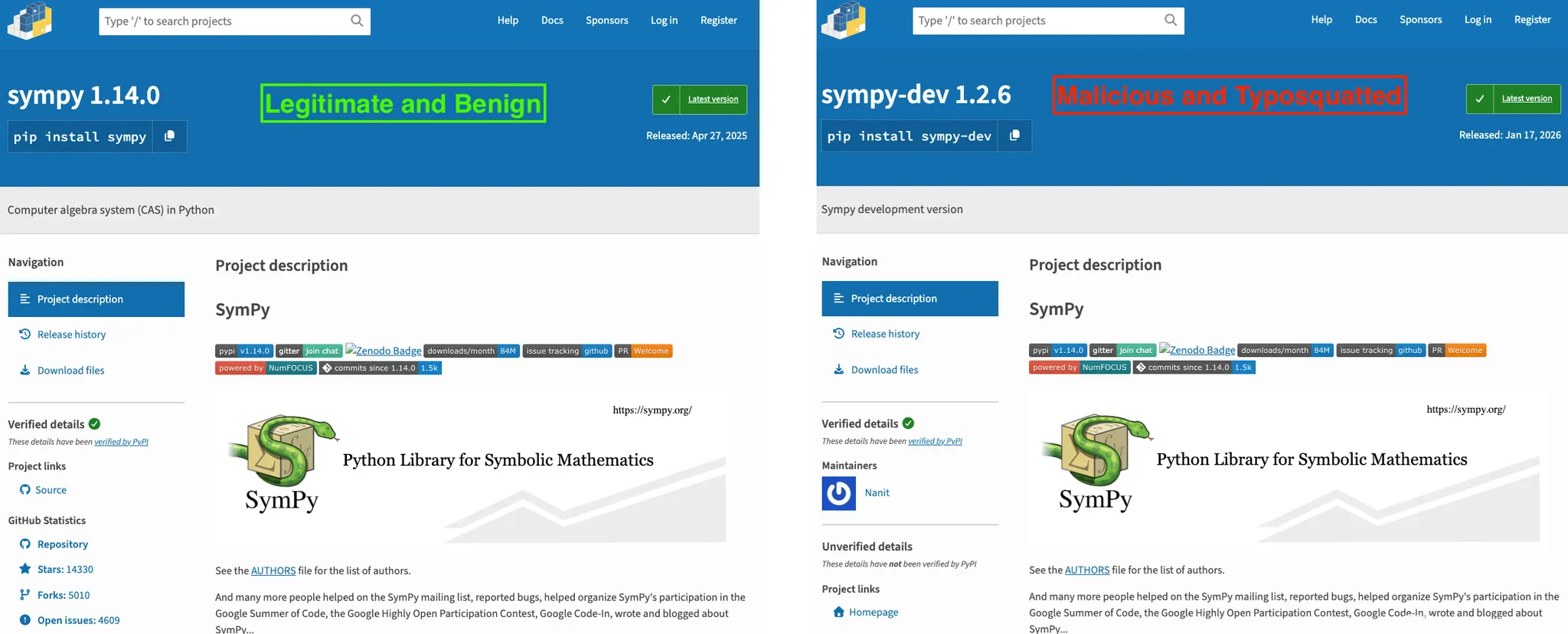 Python 生态中出现了一起隐蔽的新型供应链攻击:一个伪装成知名数学库 SymPy 的恶意包正在将开发者的机器悄悄变成加密货币挖矿节点。Socket 威胁研究团队已将这个名为 sympy-dev 的恶意包标记为危险的 “拼写劫持(typosquatting)” 攻击,其目的是诱骗用户下载它而非正版 SymPy。