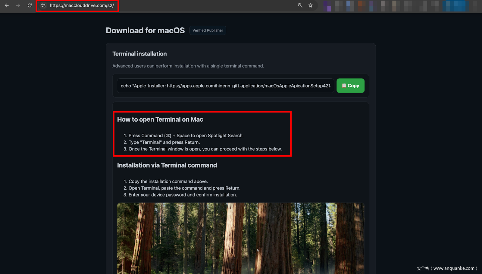 与常规下载不同,该网站指示 “高级用户” 进行 “终端安装”。“页面强迫用户复制并粘贴一条具有欺骗性的终端命令。” 报告解释道。