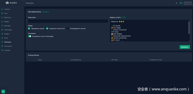 auracorp.cfd 的 Web 管理面板控制感染终端,支持数据面板、载荷生成、日志筛选、Telegram 机器人报警等功能。