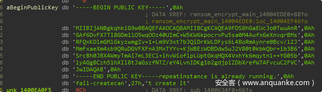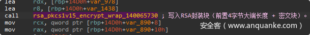与此同时,勒索软件还会调用RSA算法生成一对公私钥,对用于加密文件所使用的AES-GCM的密钥进行加密。而在生成了该RSA密钥对之后,勒索软件会再次使用内置的主RSA公钥,加密上述现场生成的RSA私钥,并对现场获取到的用户名和机器名等信息进行加密。