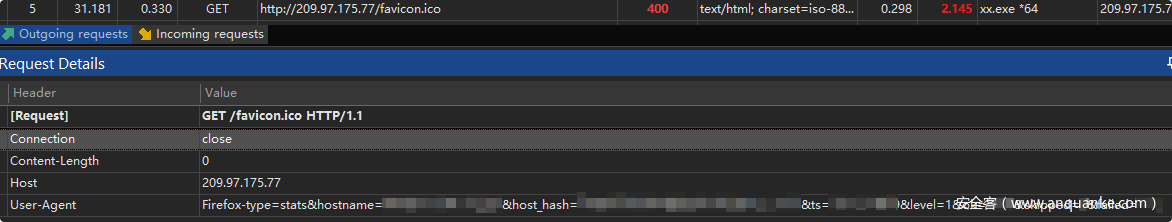 最终,勒索软件会将上述信息通过GET请求在User-Agent字段中传递到黑客服务器上。