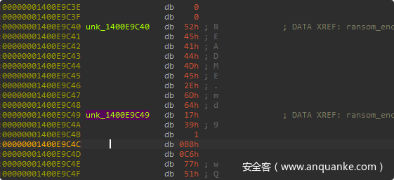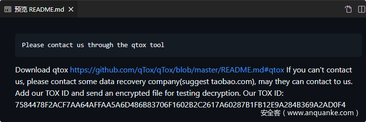勒索信内容是采用了亦或加密后的一段固定长度(0x184字节)的数据,勒索样本会在加密完成后,将其内容解密到一份ReadMe.md文件当中。