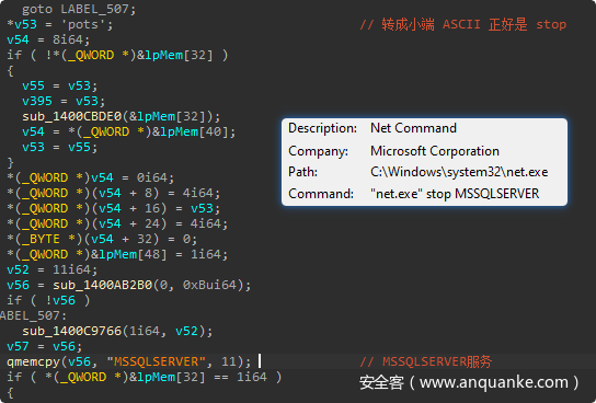 我们以一个典型的勒索软件样本为例,其在运行后会首先停止MSSQL的相关服务。在诸多数据库服务中,勒索软件唯独停止了MSSQL相关服务,可见其勒索目标对服务器系统的针对性极强。