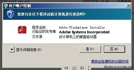 首先我们在win7系统下先打开procmon监控软件,清除一下日志信息,然后运行我们的目标文件install_flashplayer15x32_mssd_aaa_aih,运行过后会弹出UAC选项,需要用户确认授权。