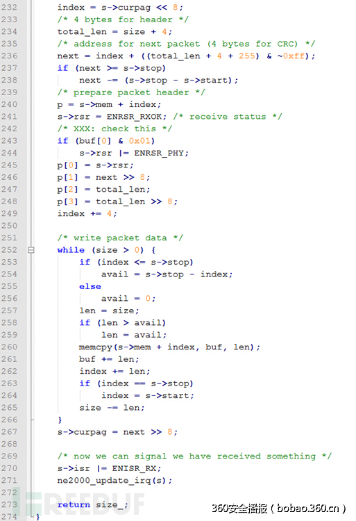 该漏洞发生在ne2000网卡模块的接收数据包的过程,相关代码截图如下。这部分代码取自qemu-2.4.0/hw/net/ne2000.c文件中的ne2000_receive函数。ne2000_receive函数是虚拟机接收外部数据包的关键函数,其大致流程为: