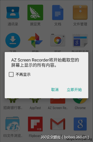 在上图中,“AZ Screen Recorder”为需要录制屏幕的软件名称,“将开始截取您的屏幕上显示的所有内容”是系统自带的提示信息,不可更改或删除。用户点击“立即开始”便开始录制屏幕,录制完成后在指定的目录生成mp4文件。