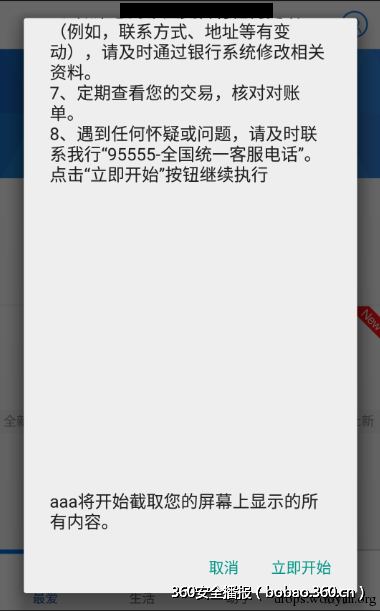 这段demo名称实际上是仿照了一段手机银行的风险提示。 我们再通过AlarmManager构造一个轮询服务,每隔3秒钟查询一次当前正在运行的应用程序进程名称,当检测到某行客户端启动后,发起录制屏幕请求,此时,系统就会弹出请求提示框效果如下图: