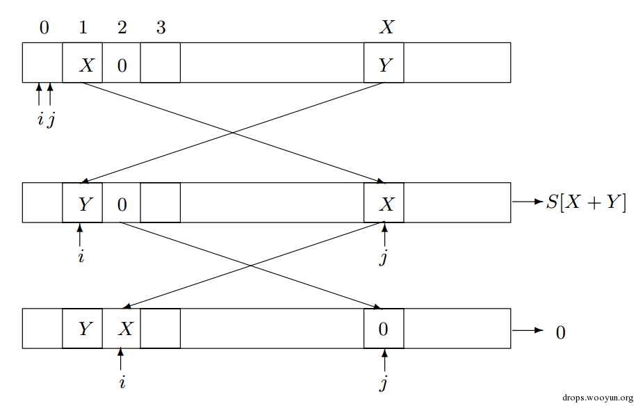 在S盒初始化结束,生成密钥流的过程中,假设S2=0,S1=X≠2,S[X]=Y,根据伪随机数生成算法,第一轮,S[X]和S1互换,生成的密钥字节是S[X+Y];第二轮,S2和S[X]互换,生成的密钥字节是S[X]=0,即Z2=0。