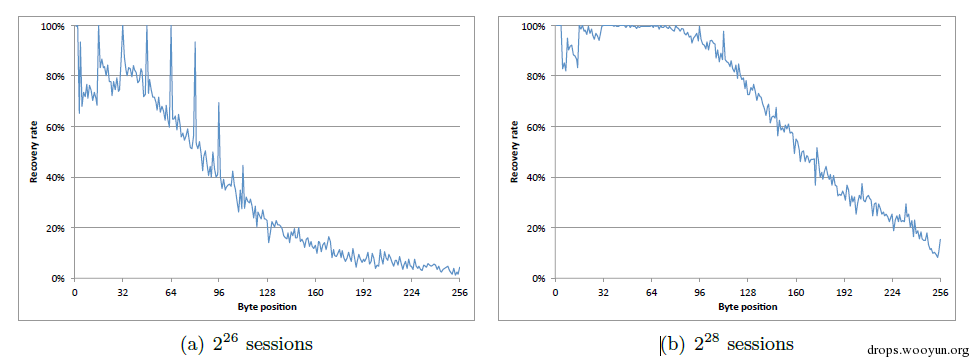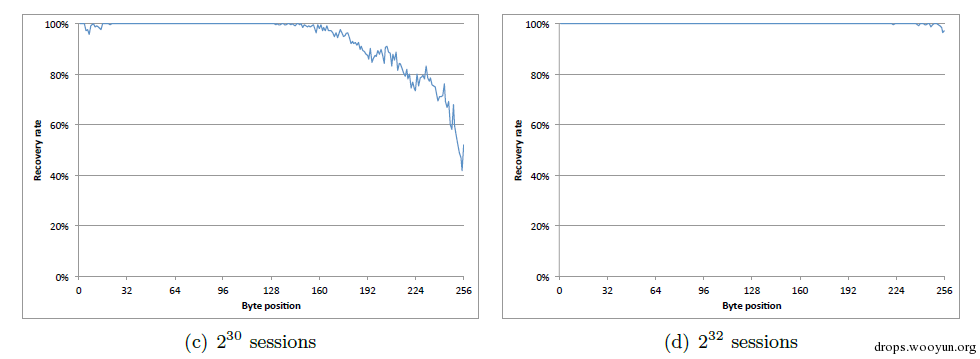 实验结果:当搜集的密文数为2^26时,前96个字节恢复的概率均超过50%;当密文数为2^32时,恢复的概率基本为100%。