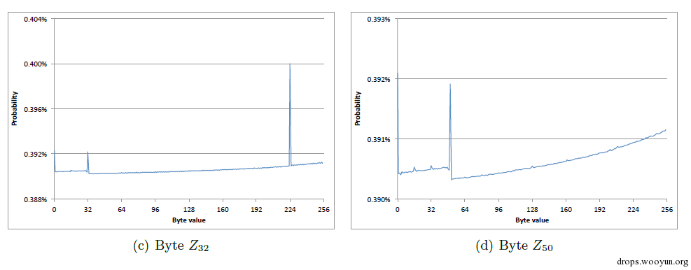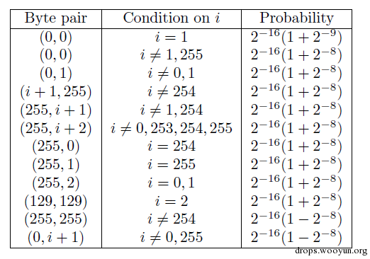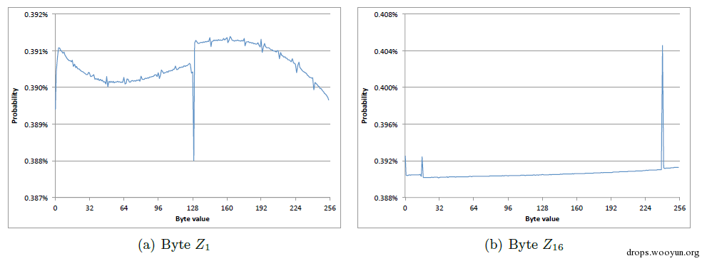 在密钥随机的前提下,如果密钥流是均匀的话,每个字节出现的概率应该是1/256=0.3906%,但从理论分析和实验结果来看,密钥流某些位置上的某些字节出现的概率要明显高于(或低于)其他字节,即偏移(biase)