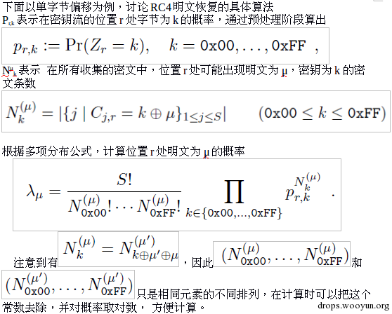 基于概率论的相关公式,我们就可以利用RC4密钥流中的偏移特性,对明文某一字节出现的概率进行计算,从而攻破RC4.