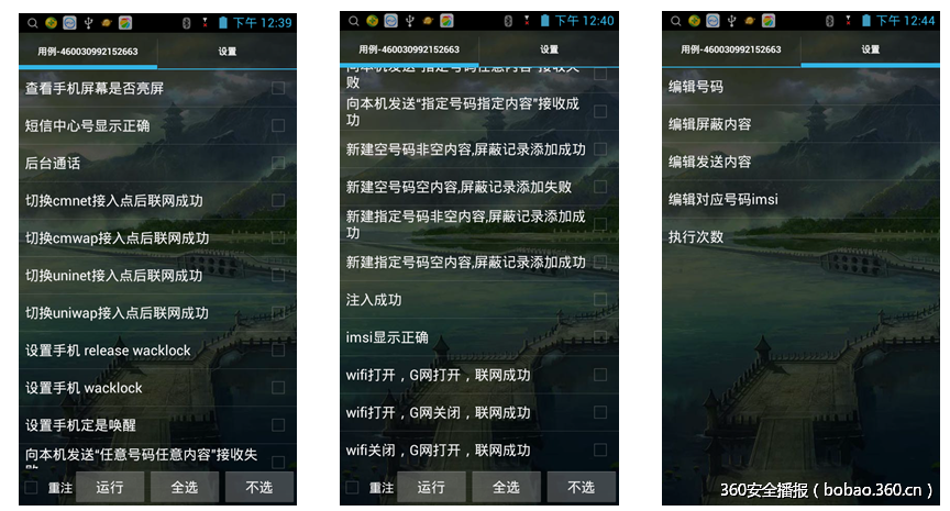 通过该测试程序我们能更加清晰的了解木马作者的意图。木马作者编写调试工具对自己编写的所有模块的功能进行了全面测试,如获取手机信息、注入行为成功与否、短信屏蔽与拦截、短信发送、APN切换等多种功能。