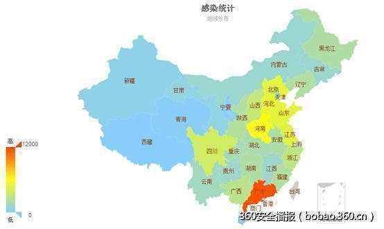 从地域分布来看,广东省是受到该木马影响最大,分布图如下图所示: