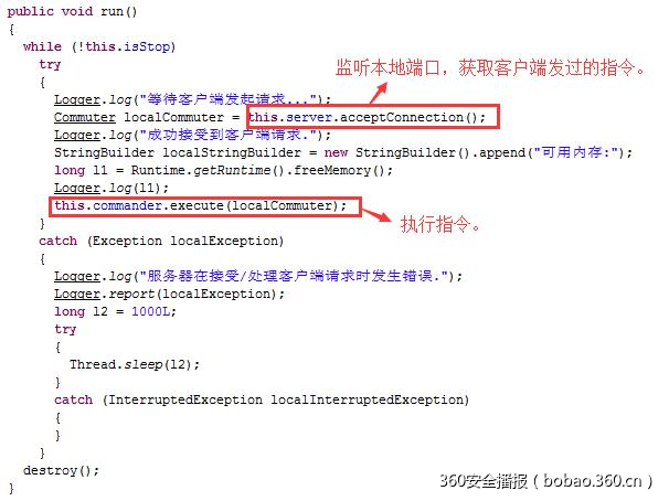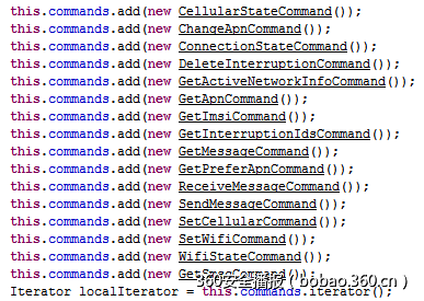 main函数首先会初始化16个Command类。这些类会根据远程服务端下发的指令实现IMSI获取、短信发送与拦截、短信读取、切换APN、获取用户地里位置等指令。