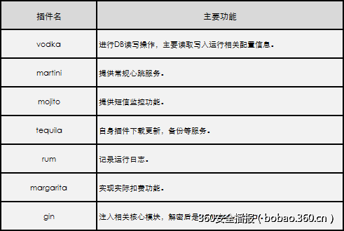 这些插件实现了接受远程服务端指令、恶意扣费、短信拦截监控、心跳、日志提交、下载和更新插件等长老木马四代的所有核心功能。