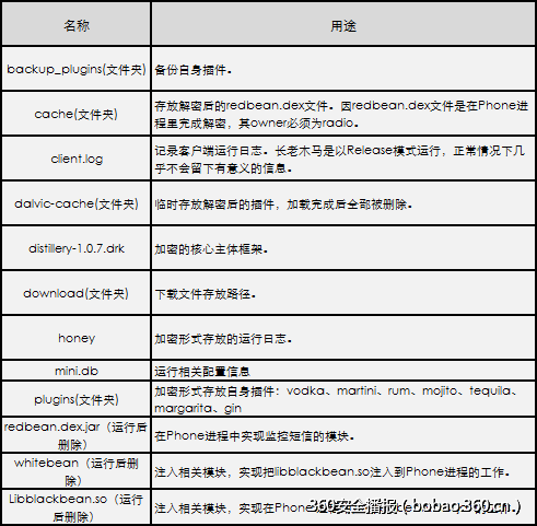 Gin插件:注入相关核心模块,解密后是redbean.dex.jar。redbean.dex.jar打包了whitebean和libblackbean模块。whitebean和libblackbean的最终目的是把readbean.dex.jar注入到Phone进程中。注入成功后readbean.dex.jar可以实现读取拦截短信内容,后台拨号等敏感恶意行为。