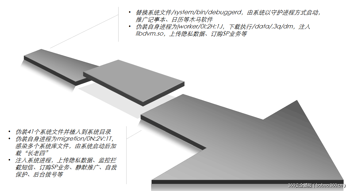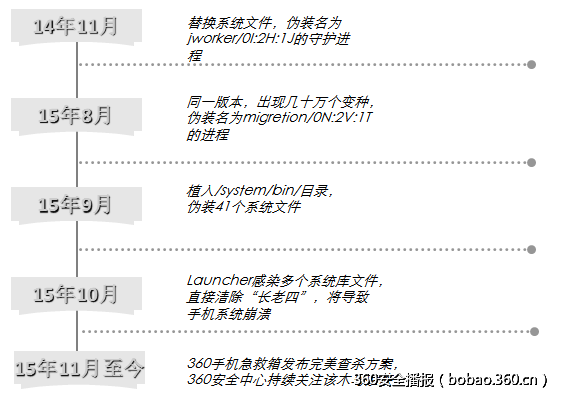 从启动方式来看,长老三代主要以替换系统原生文件为自身镜像,随系统启动时执行,由于安全软件对于这种类型的查杀方法已比较成熟,长老木马四代采用更加隐蔽的“静态感染”启动方式,将恶意代码插入到被感染的系统文件,在被感染系统文件中完成长老木马四代的启动工作。长老四代是在Android系统中首次采用感染技术的木马。