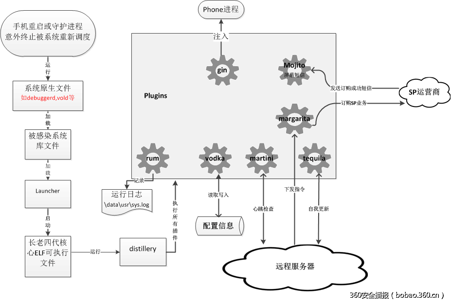 长老木马四代主要分为launcher和核心作恶的ELF可执行模块。ELF可执行模块又包括distillery、plugins及redbean三个主要部分。 redbean模块会注入系统Phone进程,具有Phone进程权限,可以在未经用户允许下,后台私自订购SP业务,屏蔽订购确认和成功短信,给用户造成经济上的损失。