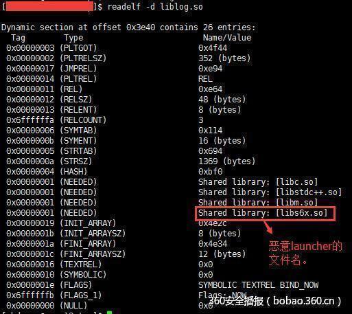 1、感染守护进程启动时依赖的正常库文件。在库文件的导入表里添加launcher的路径,使守护进程随操作系统启动时,加载并执行launcher的恶意代码。如下图所示,被感染的系统库文件的导入表中包含恶意库文件libs6x.so的路径。